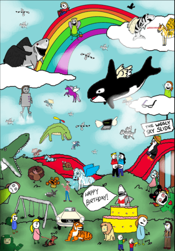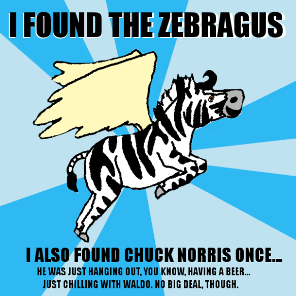 We searched far and wide. Over the rainbow, above the clouds, under the gorilla humping the shark, in the birthday cake, in the alligators mouth, on the house on the golden horse that shoots beams from his eyes back… EVERYWHERE! We even met Waldo! We were thinking about giving up, when suddenly, from under the shadow of the whale with wings, from behind the clouds, came the mystical Zebragus! And what a majestic beast he was!